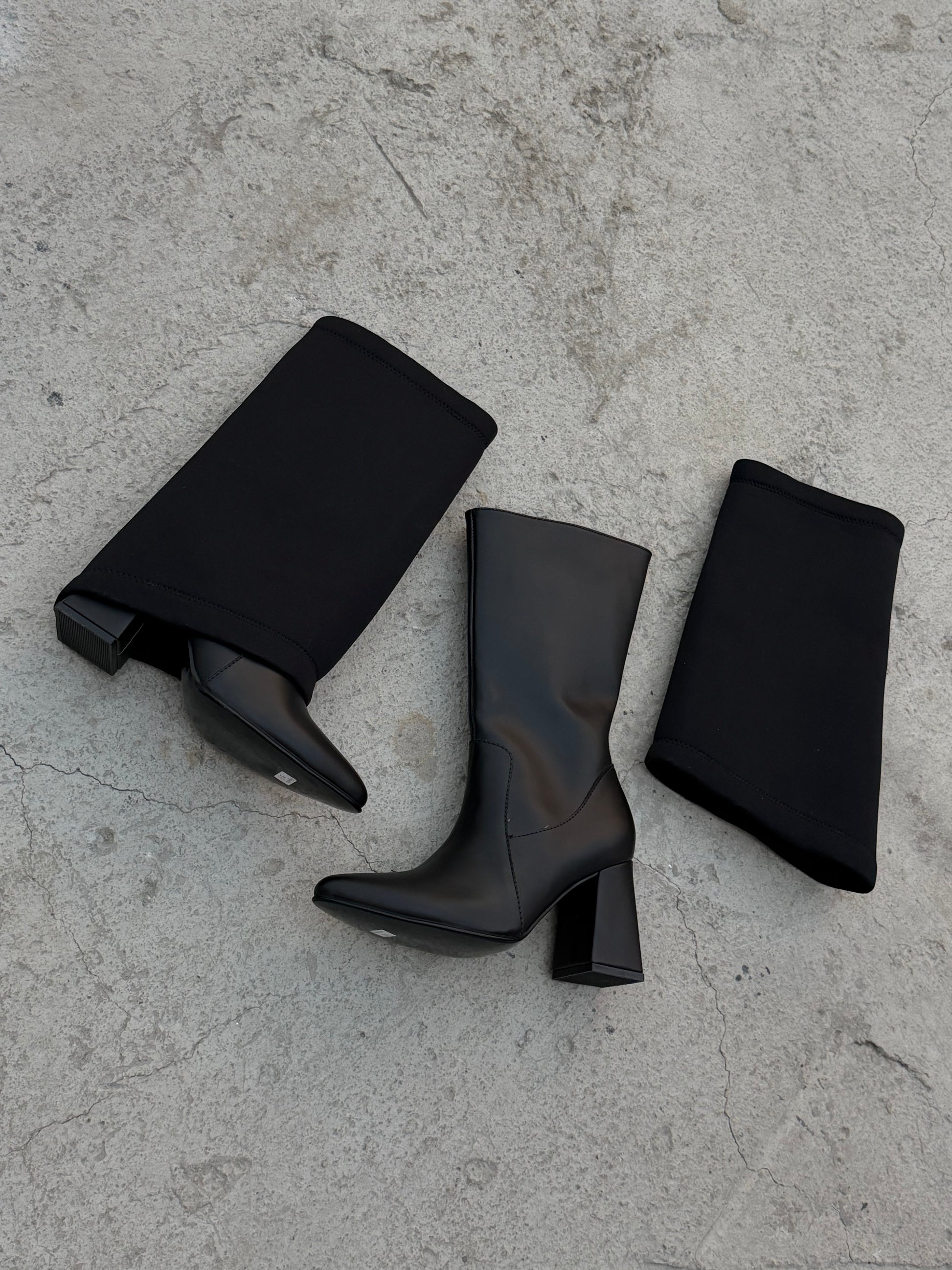 Estos botines incluyen una cremallera funcional, ubicada estratégicamente para facilitar el calce y brindar un ajuste seguro. Además, cuentan con una capa adicional en material neopreno, diseñada para crear un efecto tipo “bota larga”, estilizar la pierna y transformar tu outfit en segundos. Puedes usarla con o sin la capa para lograr dos estilos totalmente diferentes en una sola pieza.