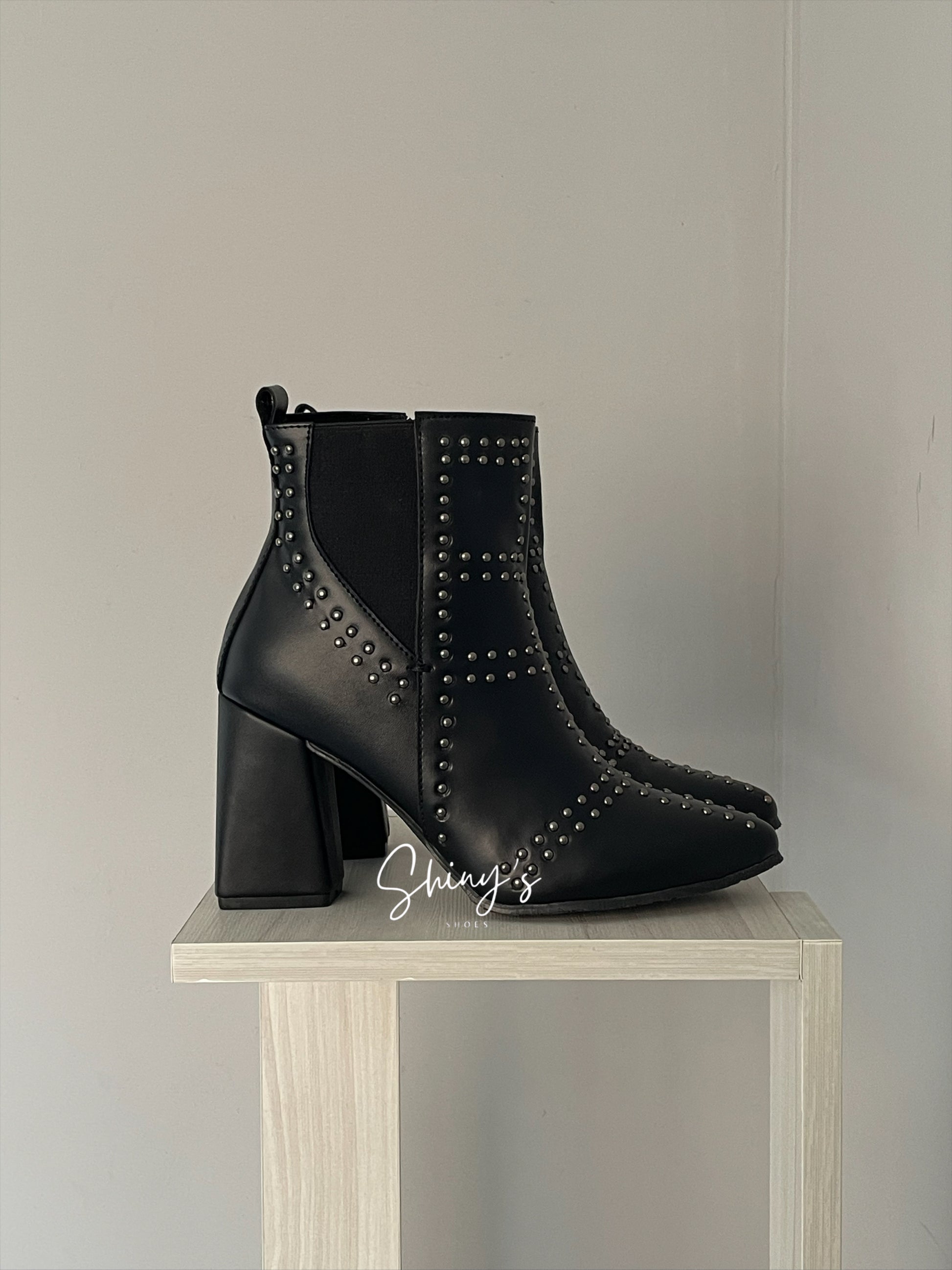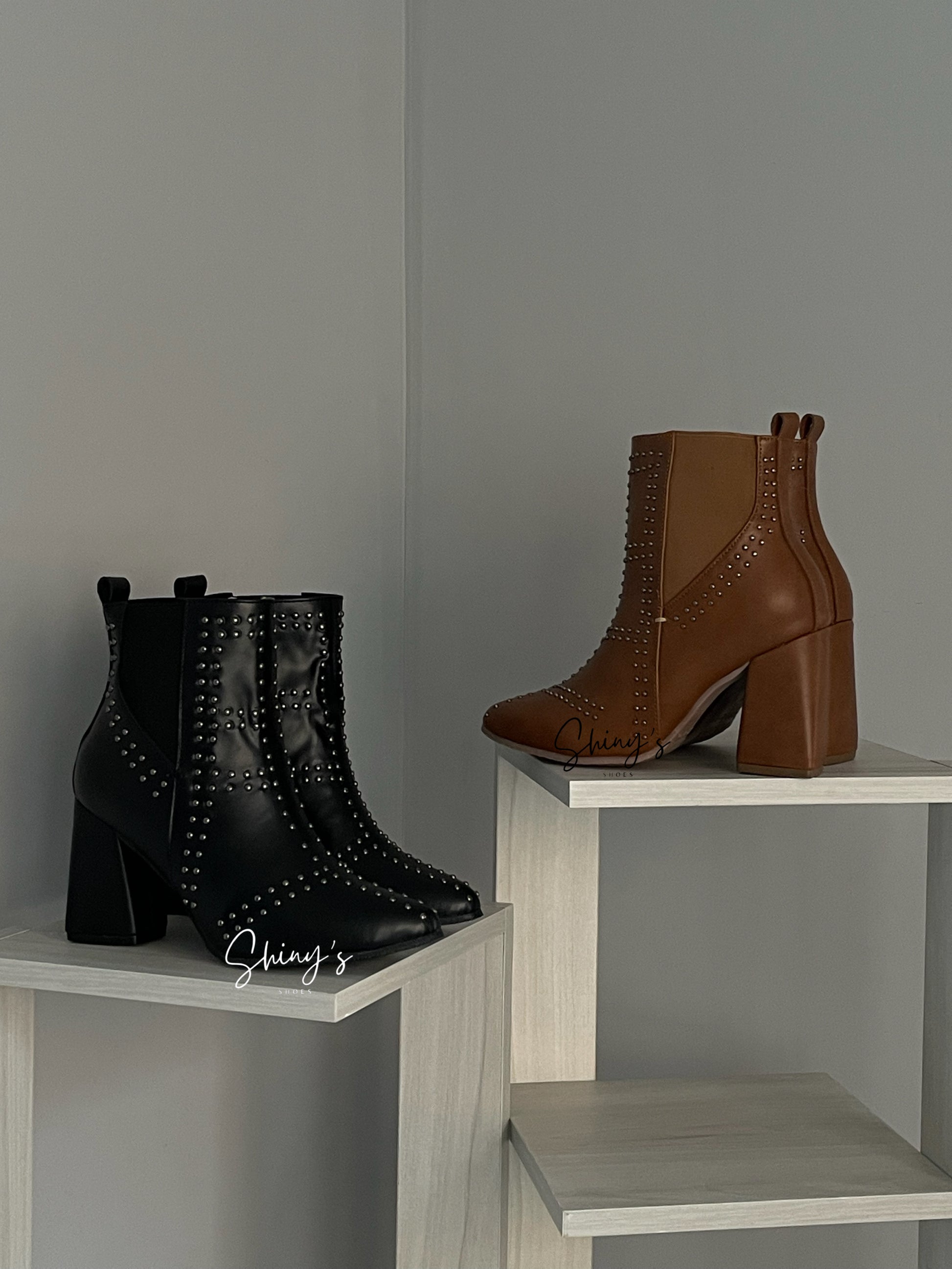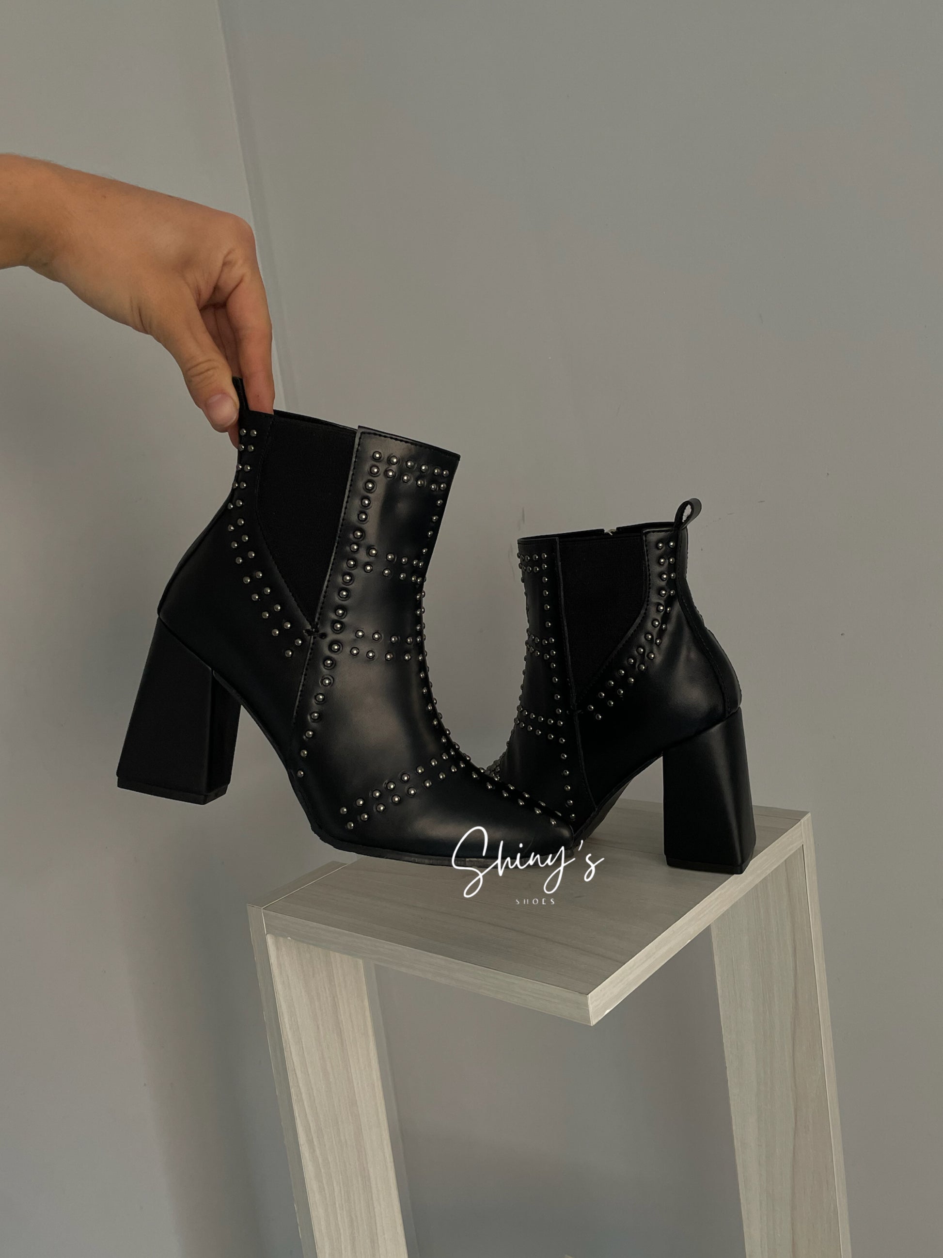 Atrévete a brillar con estos botines de diseño único. Con un tacón de 7 centímetros que estiliza la figura, destacan por su atrevido acabado con taches distribuidos en todo el botín, creando un look moderno y lleno de actitud.