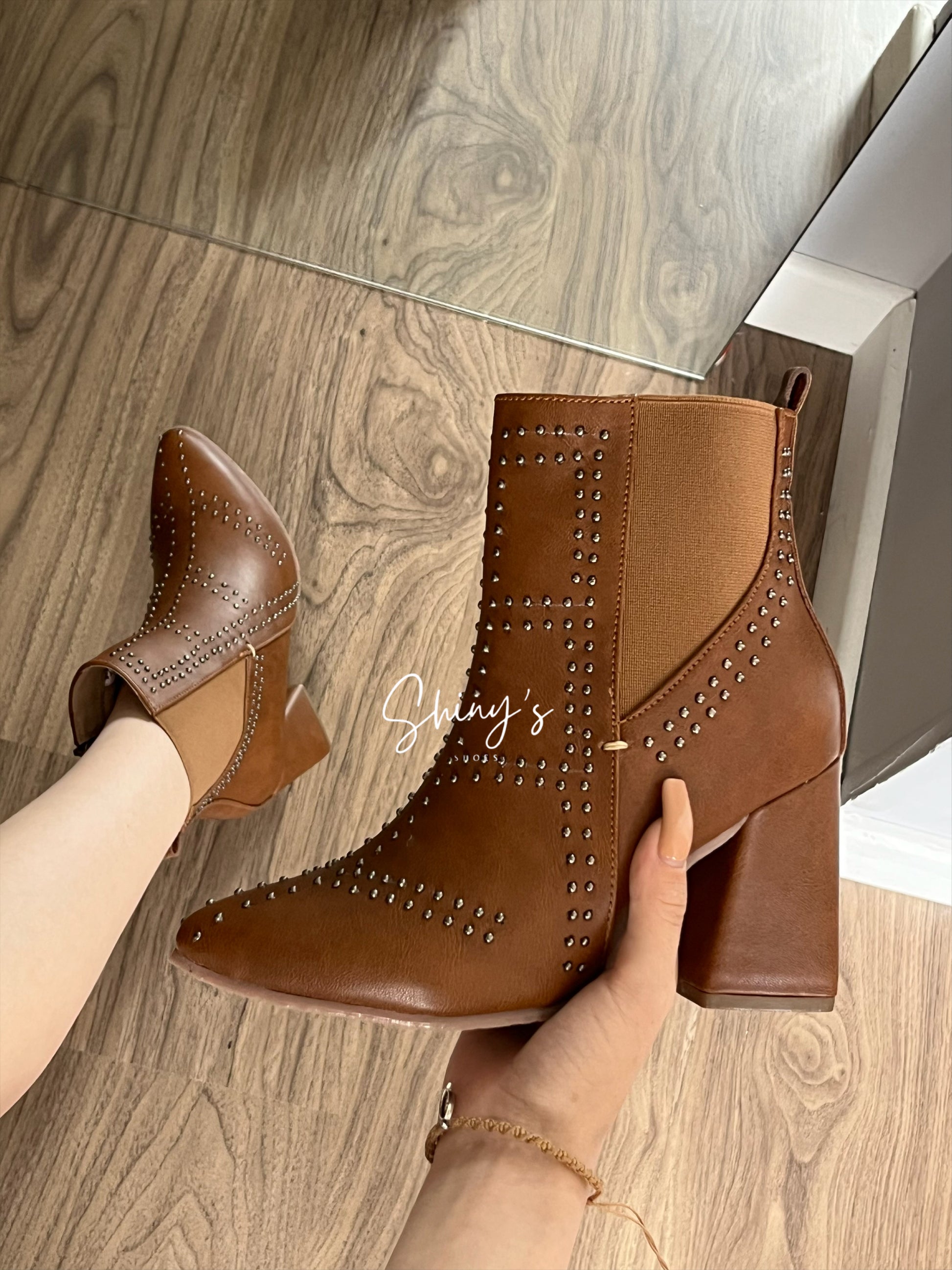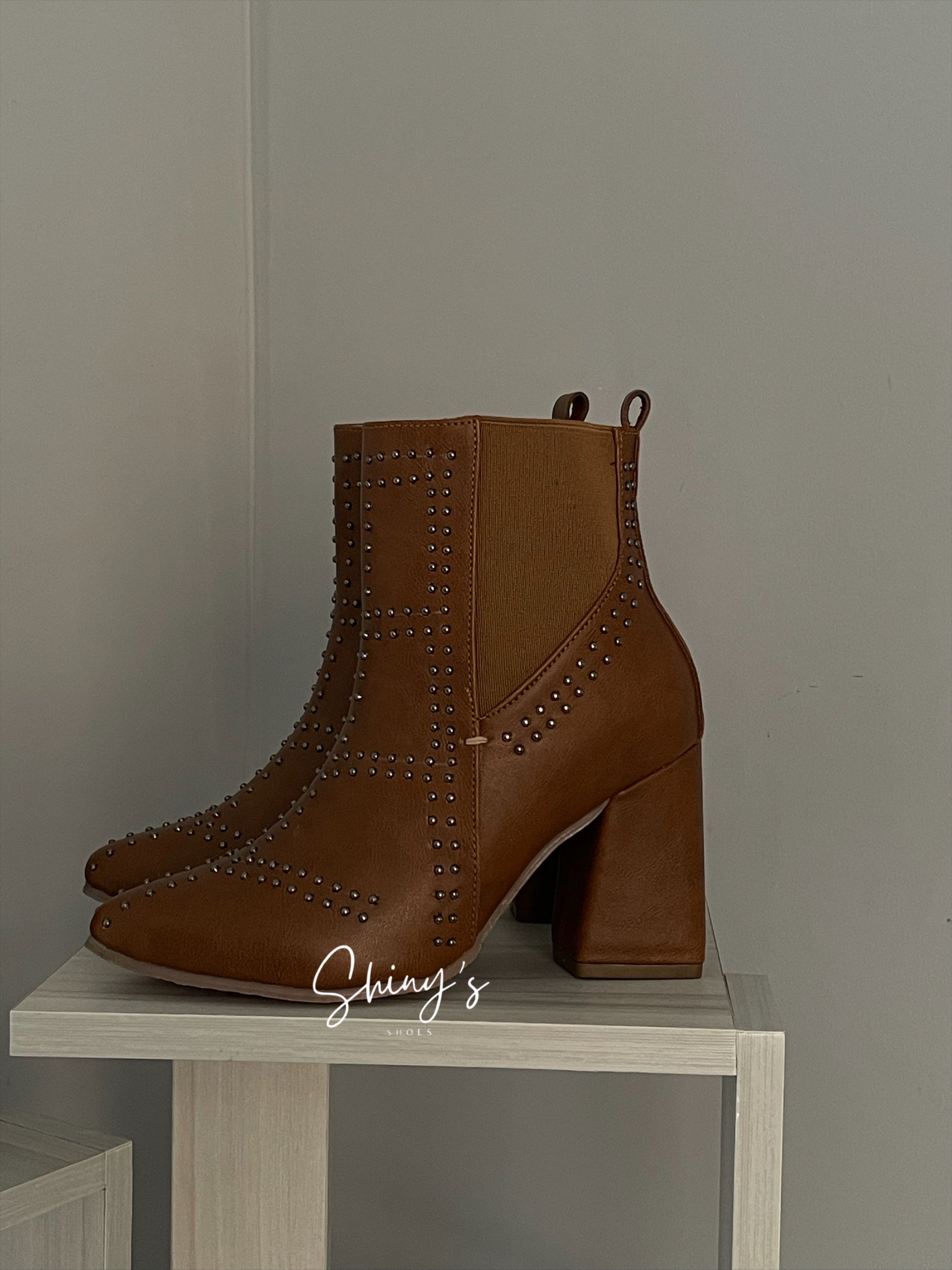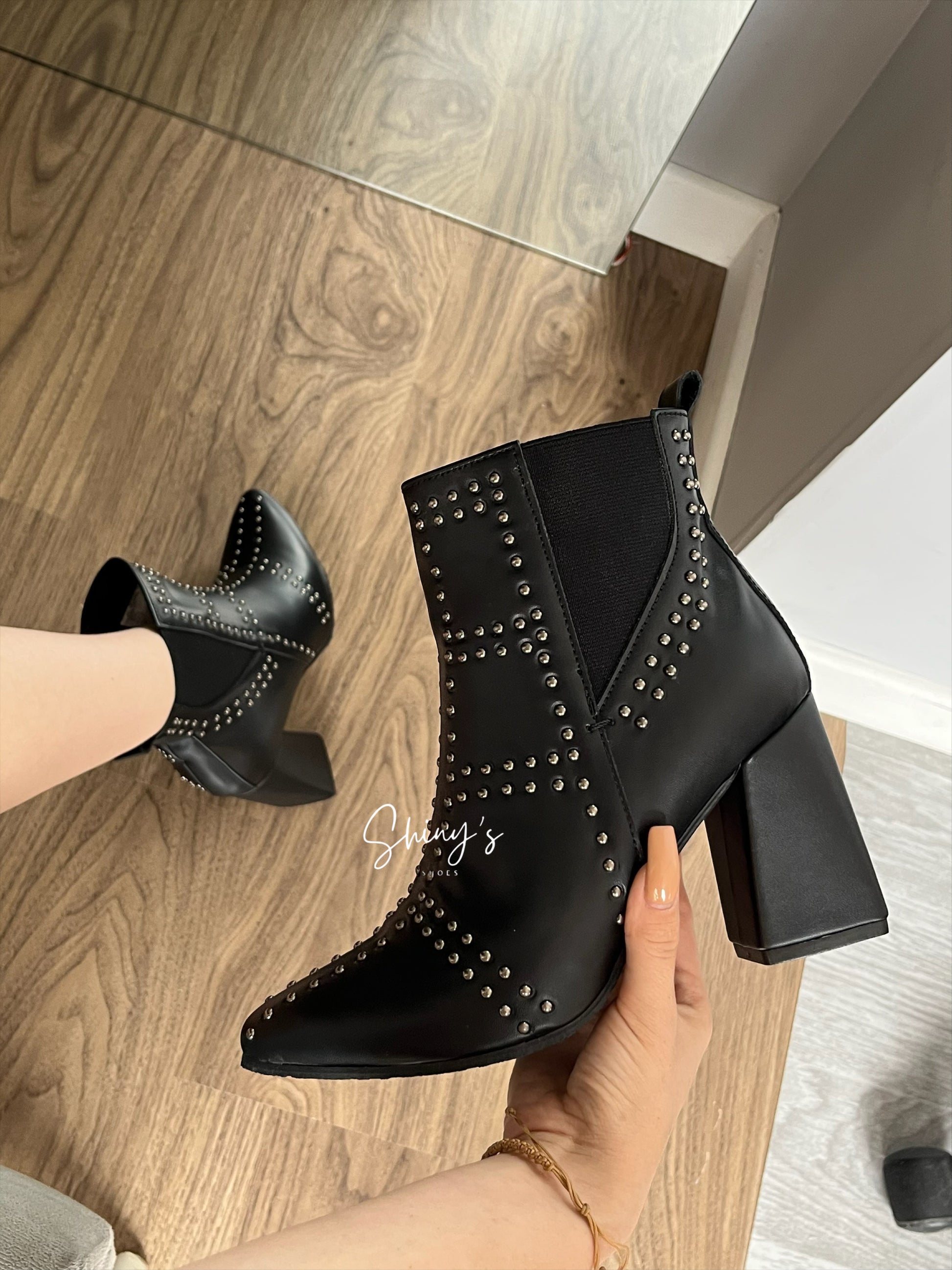 Atrévete a brillar con estos botines de diseño único. Con un tacón de 7 centímetros que estiliza la figura, destacan por su atrevido acabado con taches distribuidos en todo el botín, creando un look moderno y lleno de actitud.
