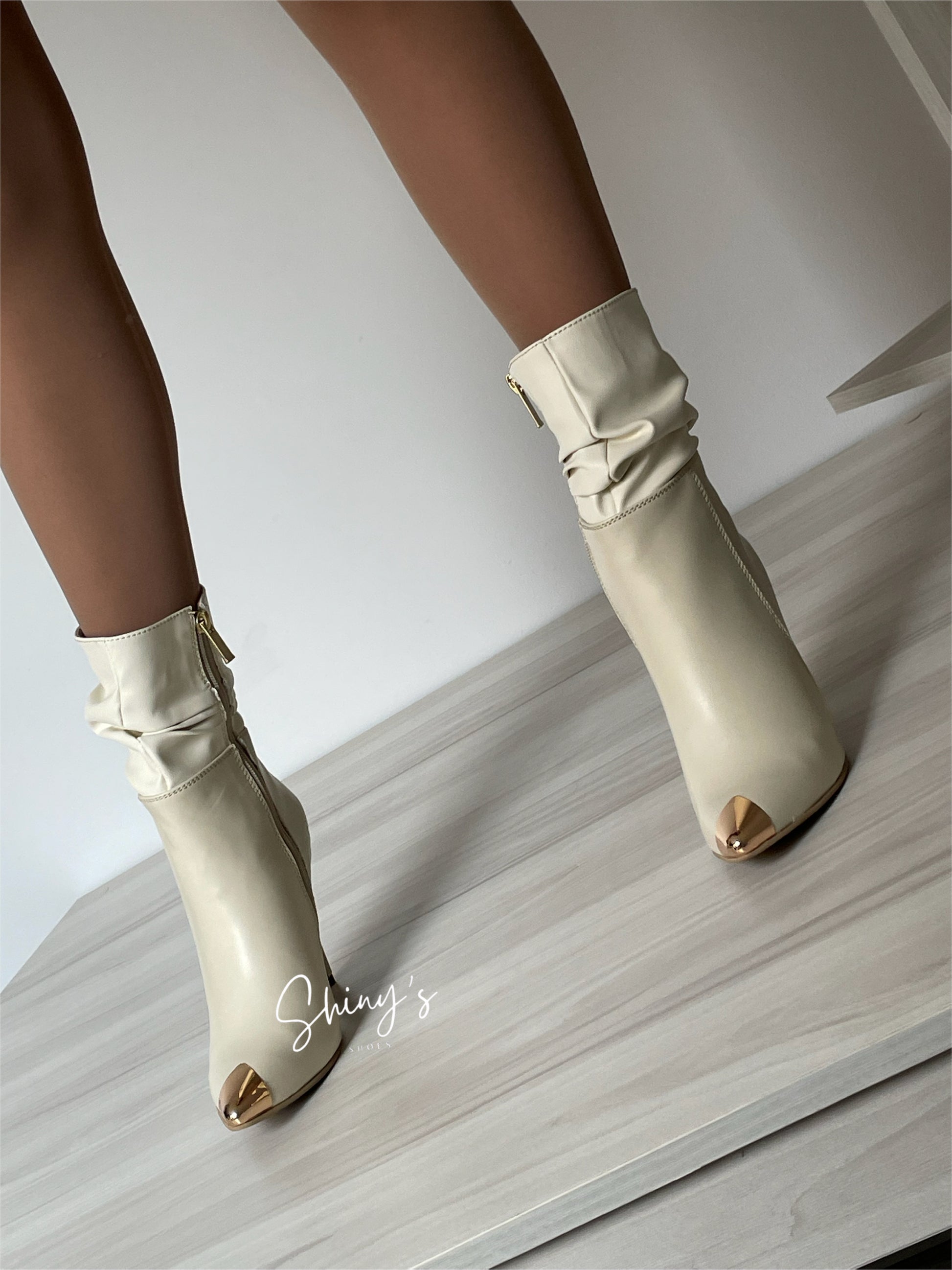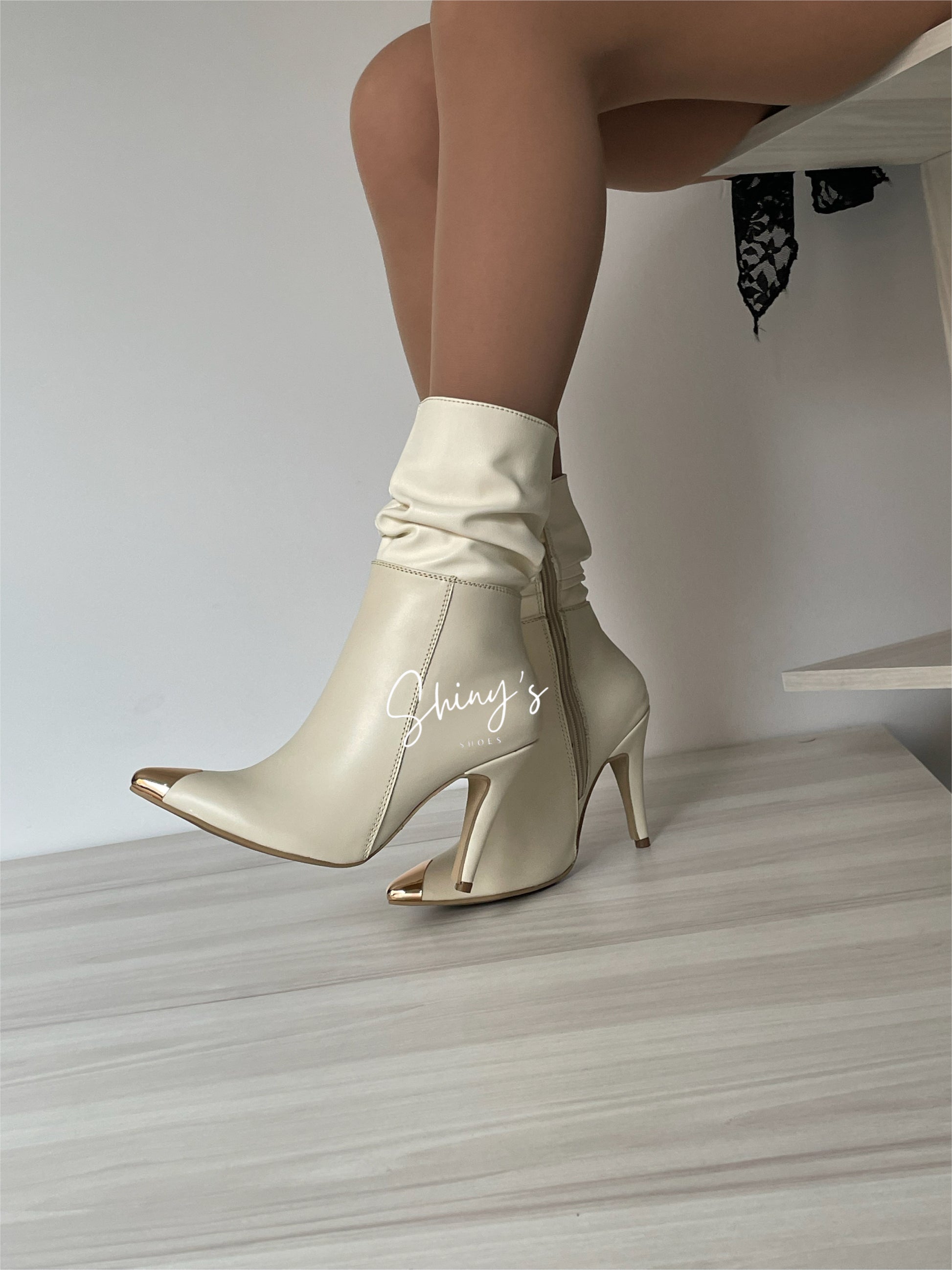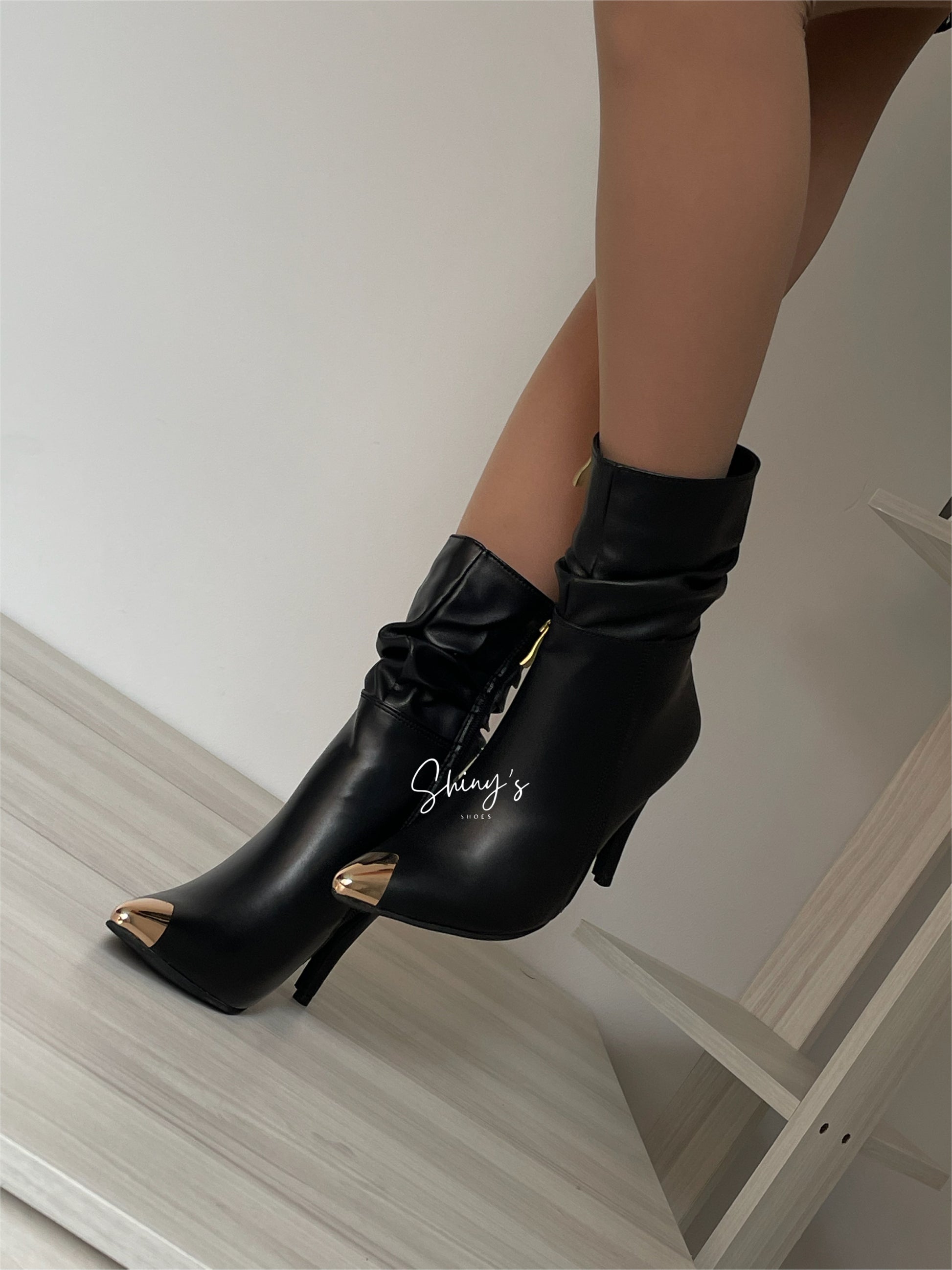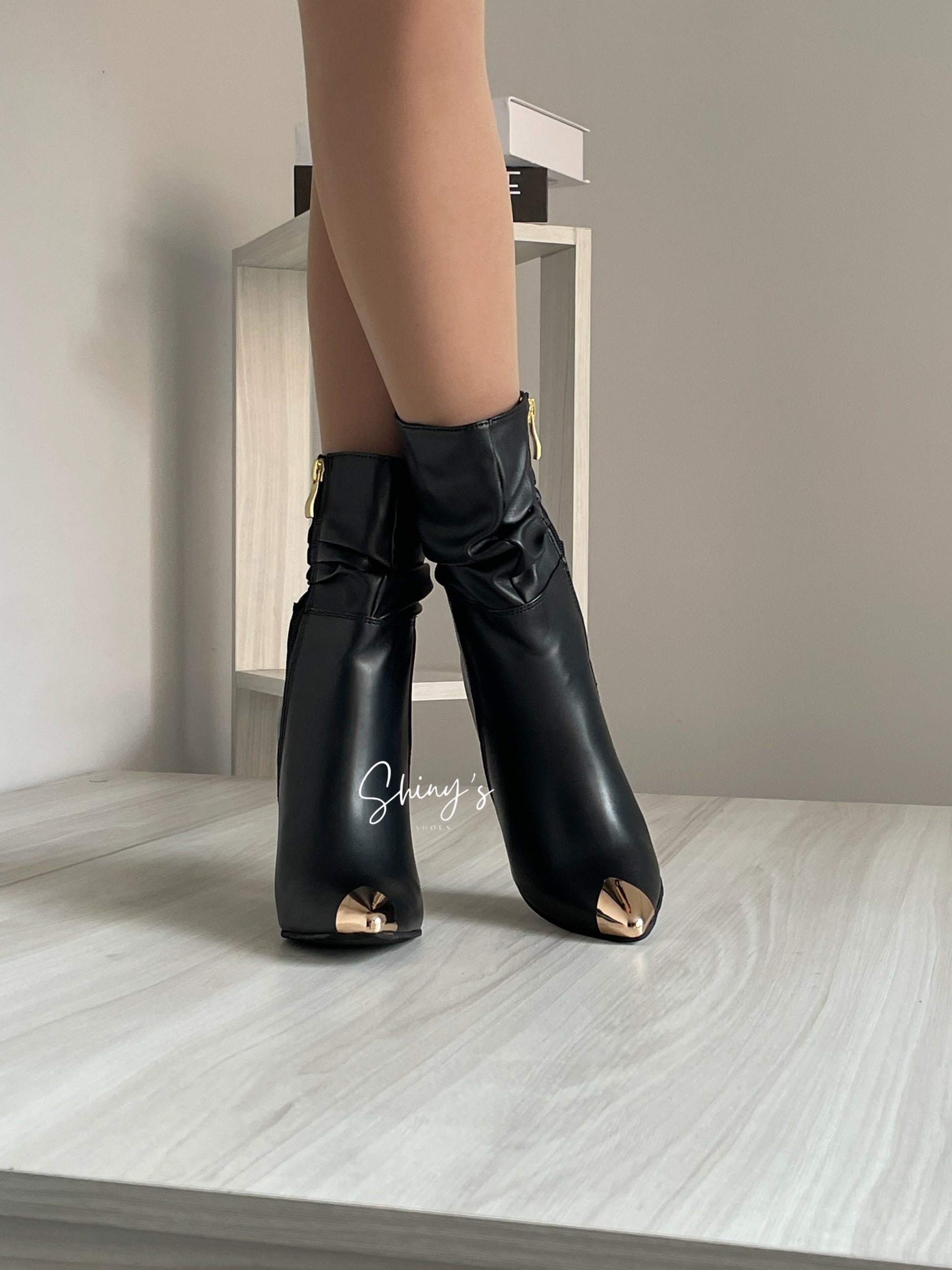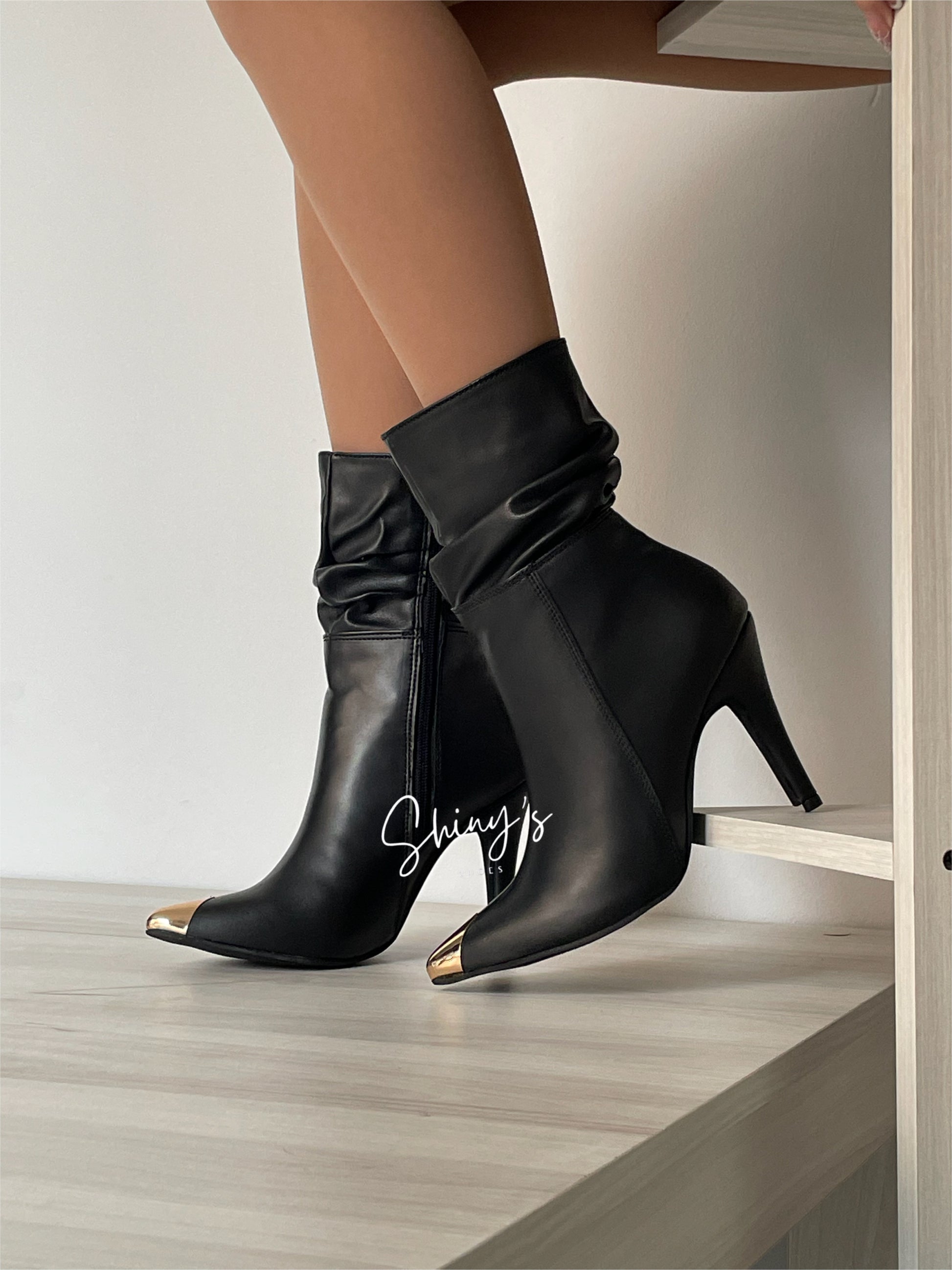 Un diseño que fusiona estilo y elegancia: elaborado en material sintético de alta calidad, con una puntera dorada en acero que aporta un toque vanguardista y distintivo. Su cremallera lateral interna funcional garantiza practicidad al calzar, mientras que la mini caña arrugada le da un aire desenfadado y único. El look se completa con un tacón puntilla de 8 cm de altura, estilizando la figura con delicadeza y manteniendo un carácter chic y atrevido.