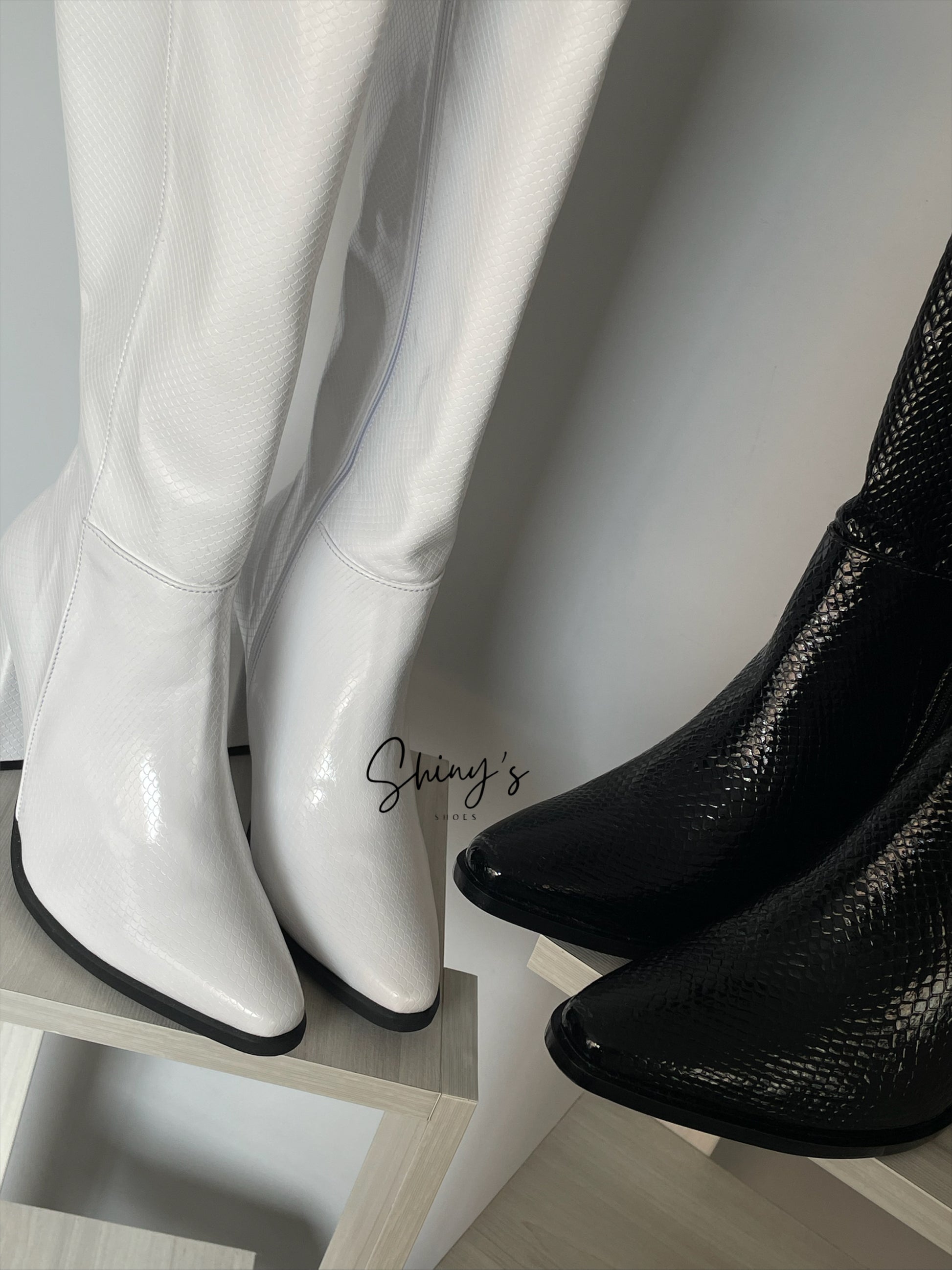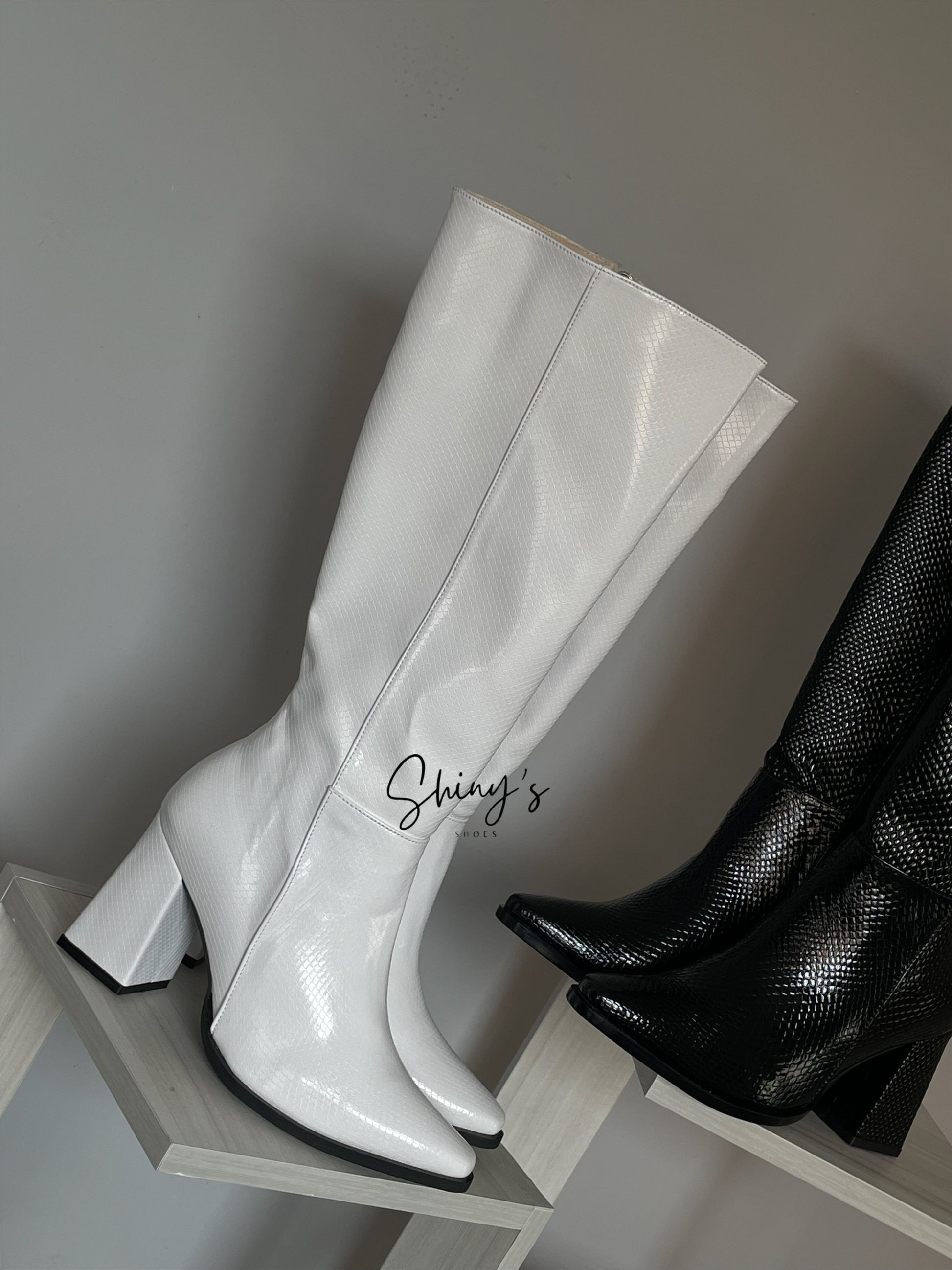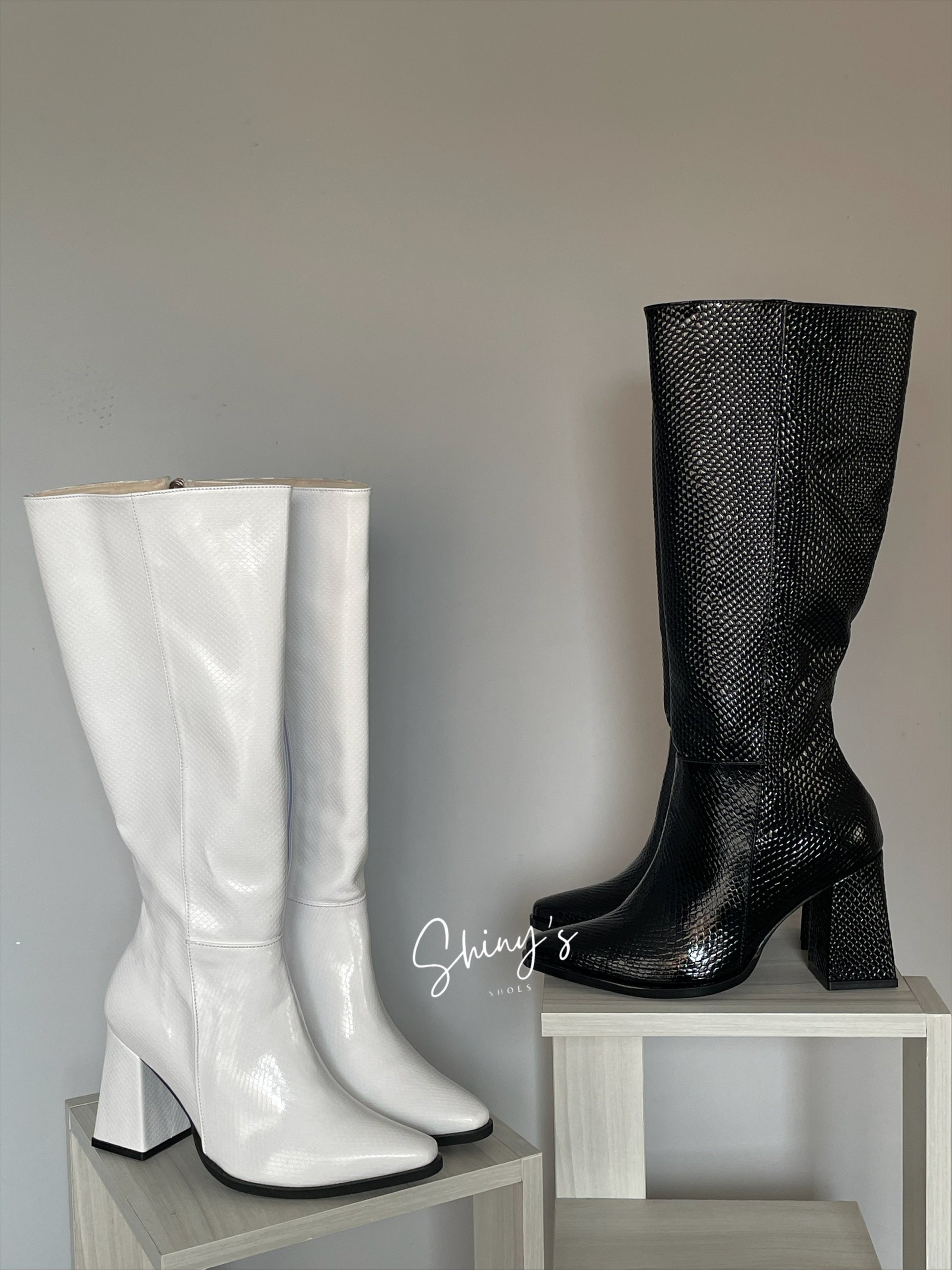 Sencilla pero impactante, esta bota de horma elegante está elaborada en material charol con efecto piel de pitón, que le da un acabado moderno y sofisticado. Cuenta con cremallera lateral interna funcional para mayor practicidad, perfecta para elevar cualquier look con un toque de distinción y estilo único.