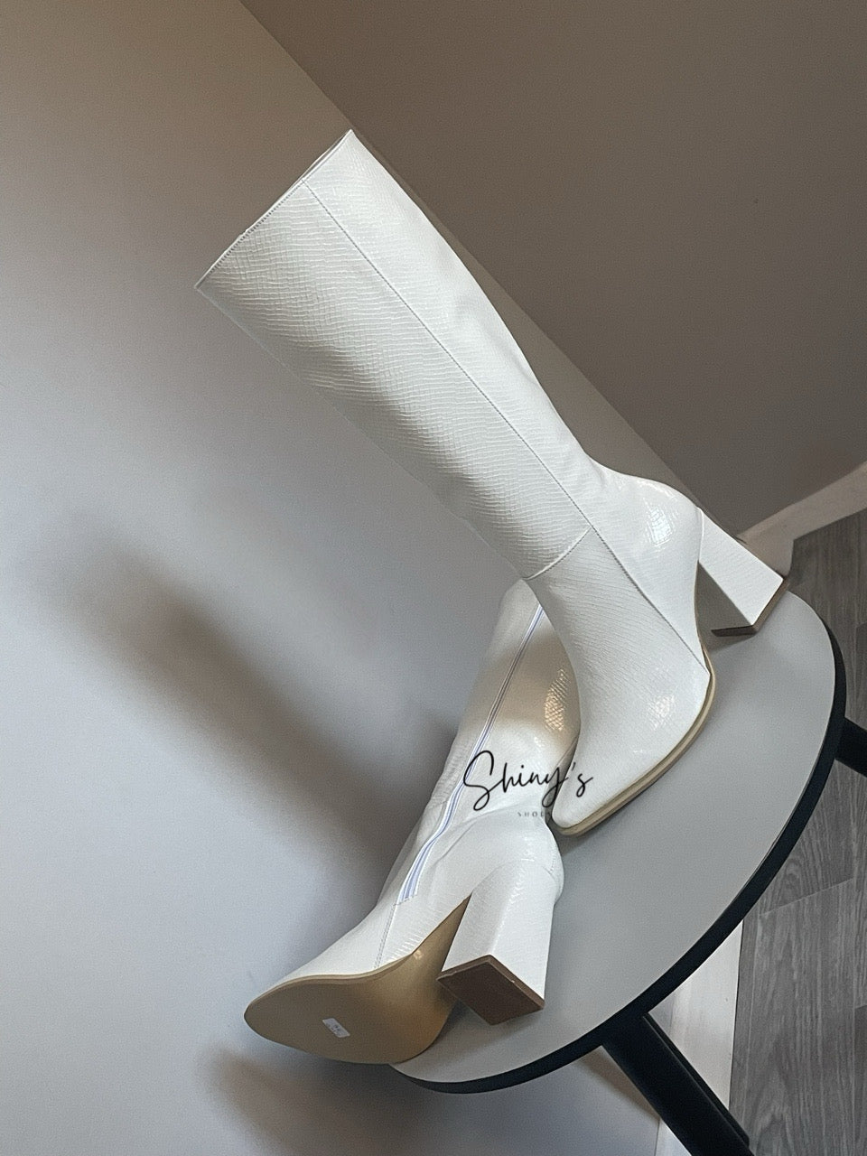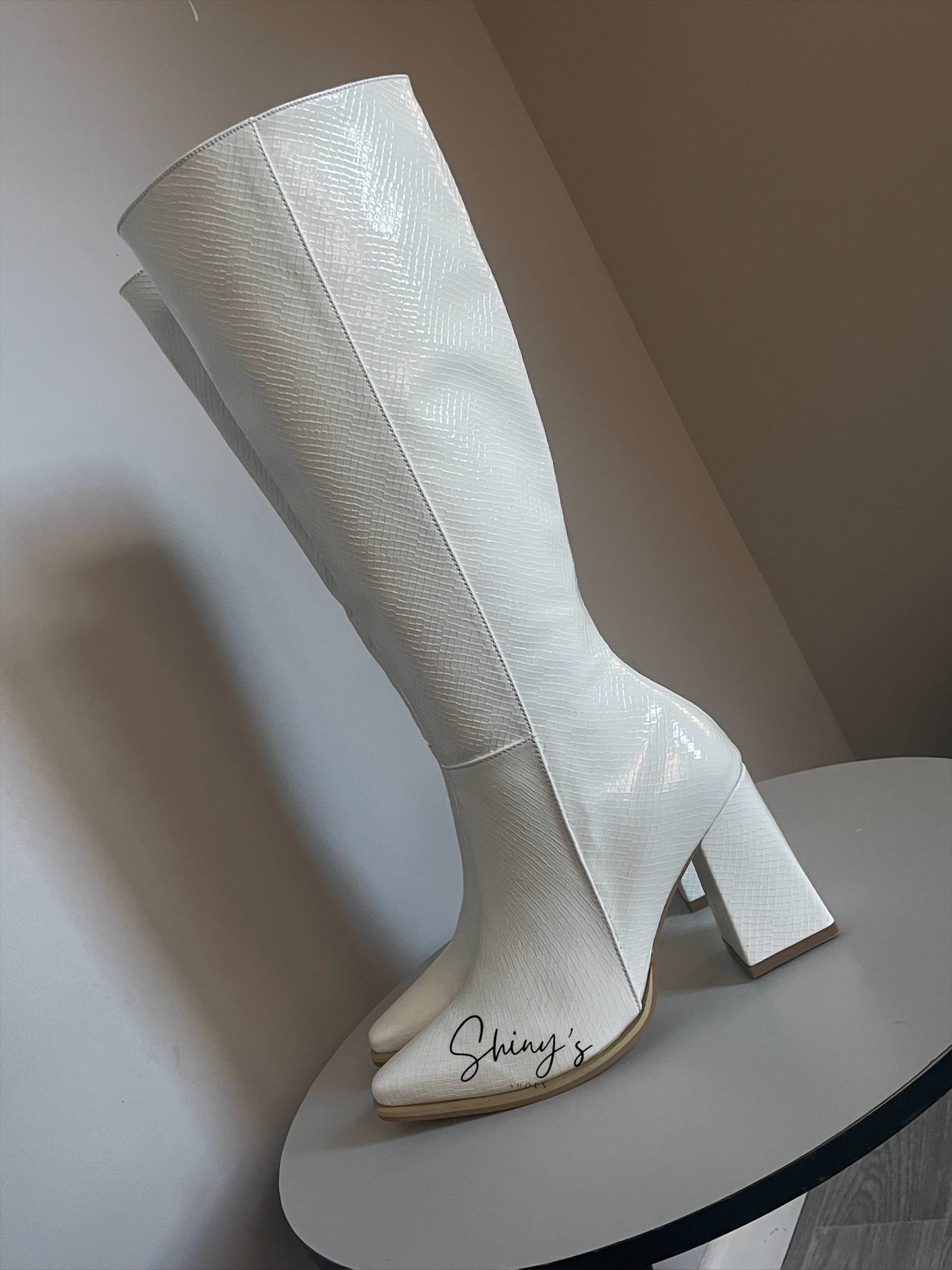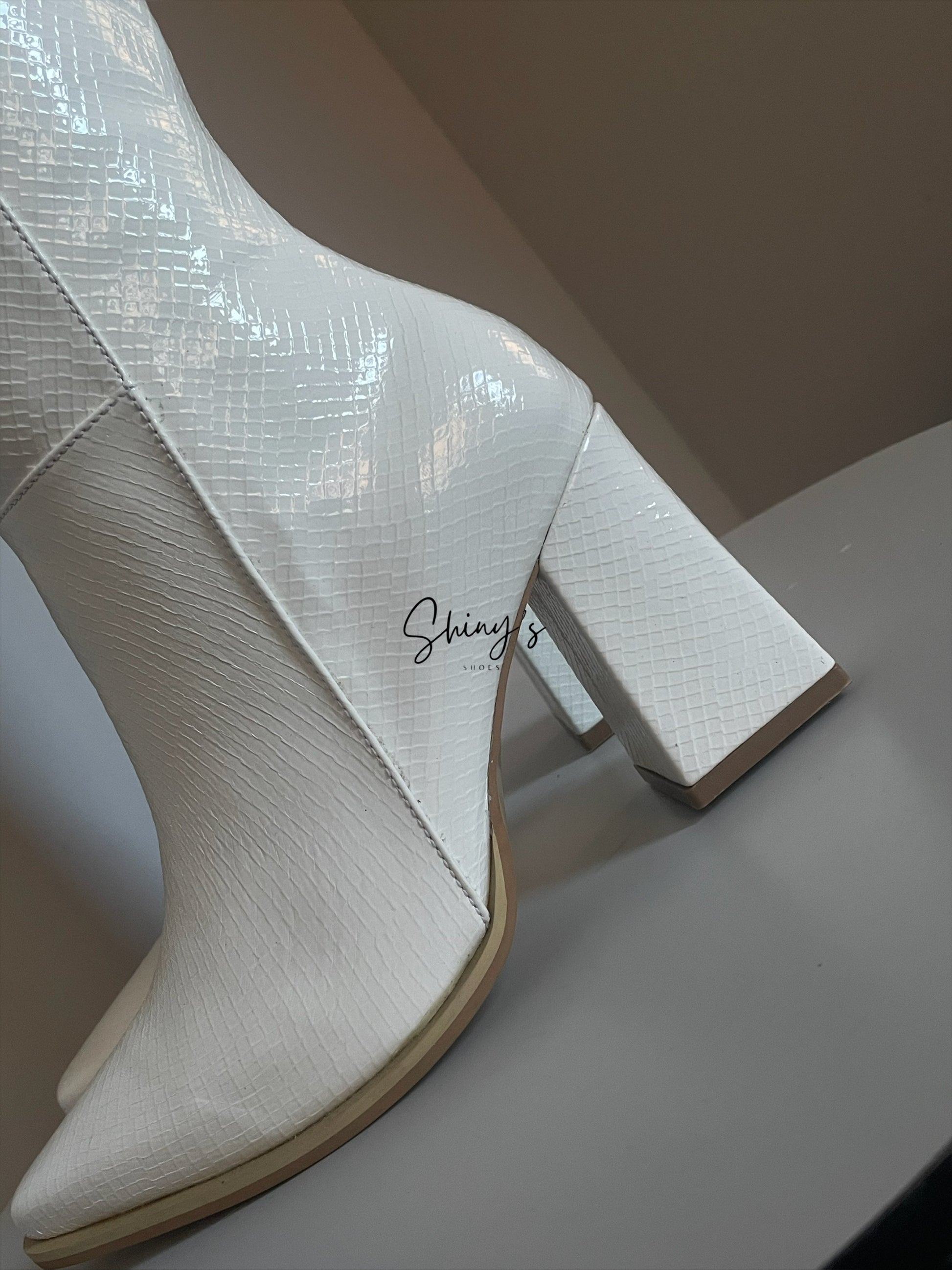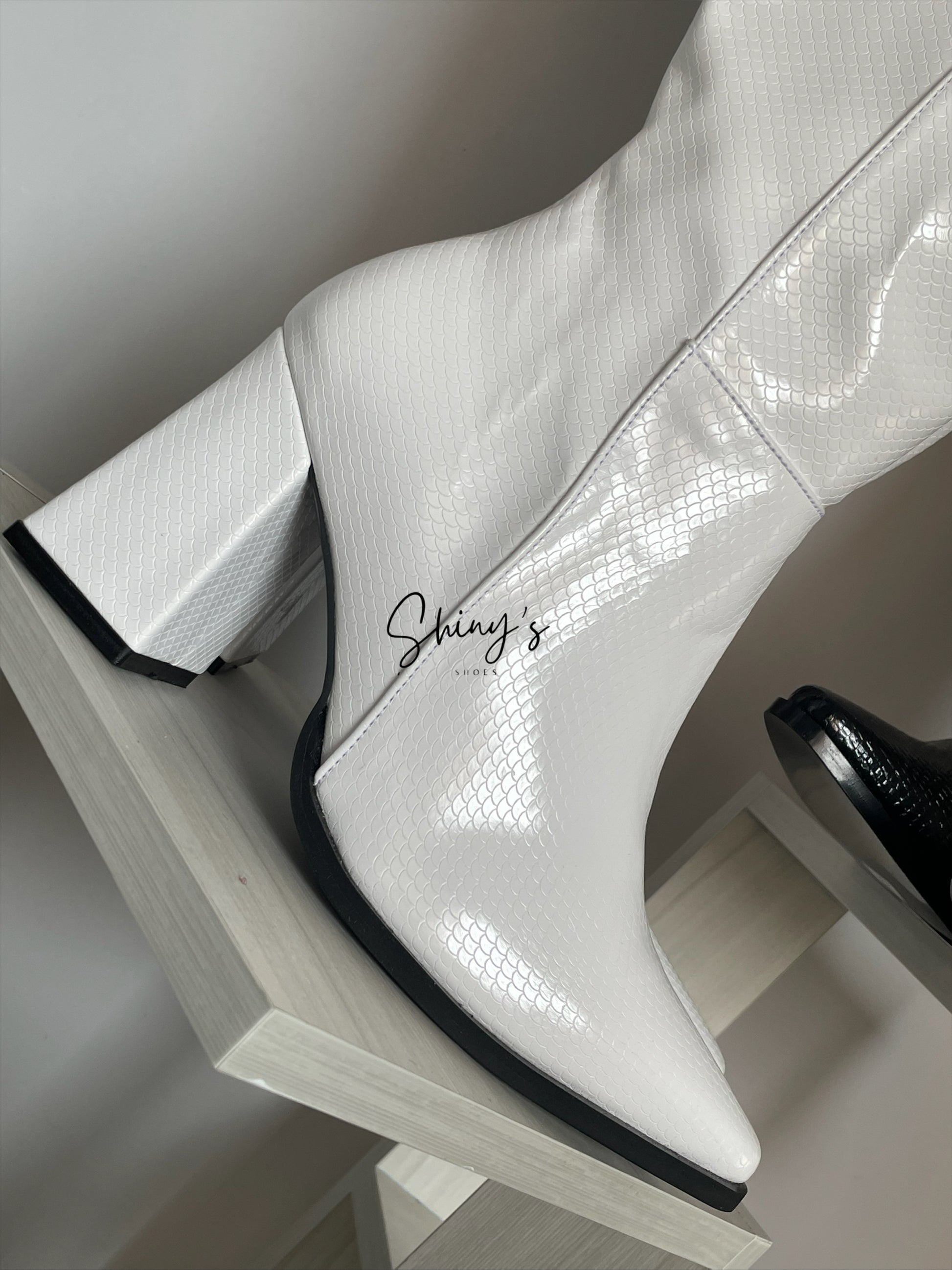Sencilla pero impactante, esta bota de horma elegante está elaborada en material charol con efecto piel de pitón, que le da un acabado moderno y sofisticado. Cuenta con cremallera lateral interna funcional para mayor practicidad, perfecta para elevar cualquier look con un toque de distinción y estilo único.