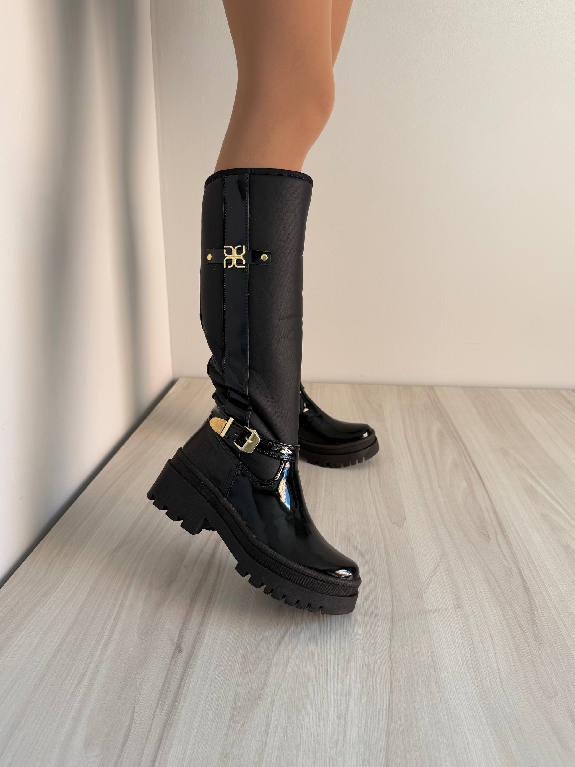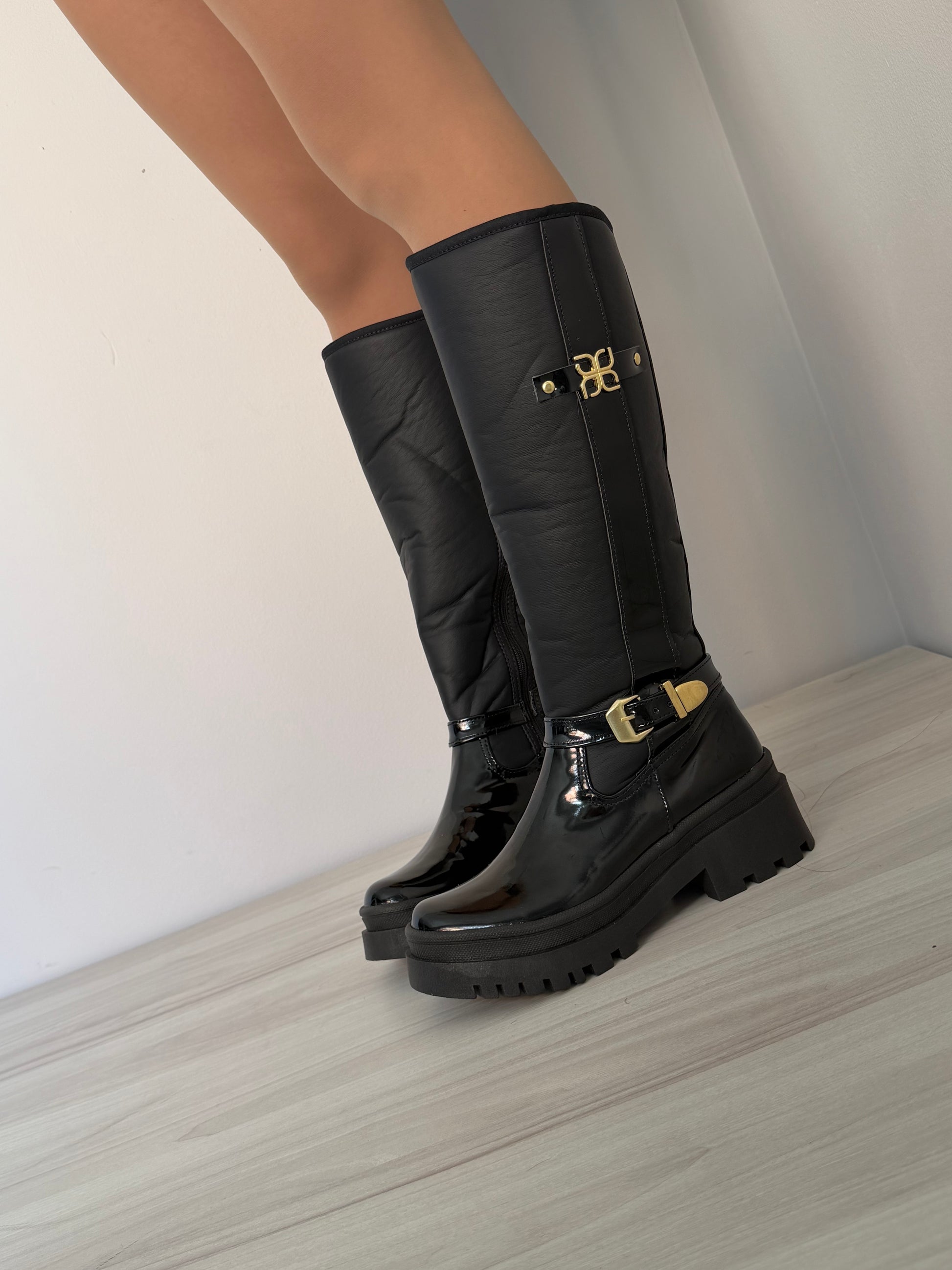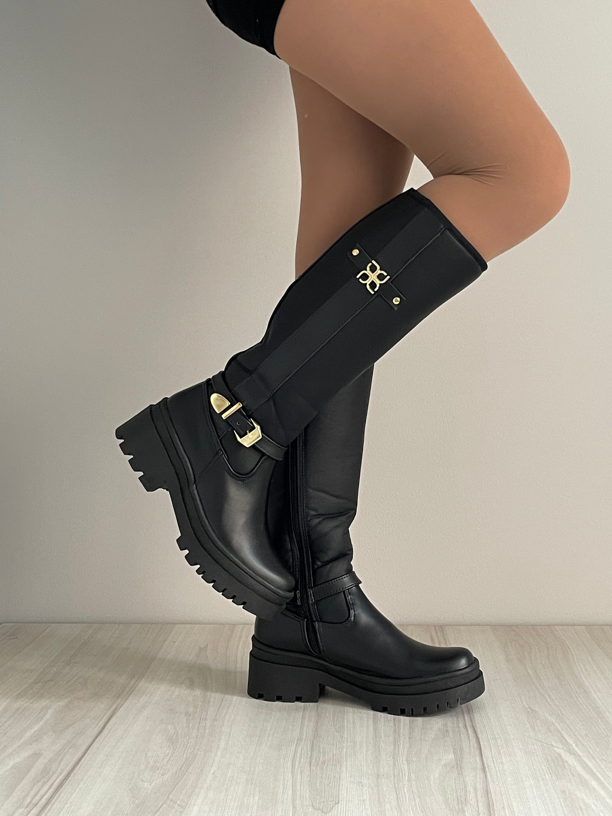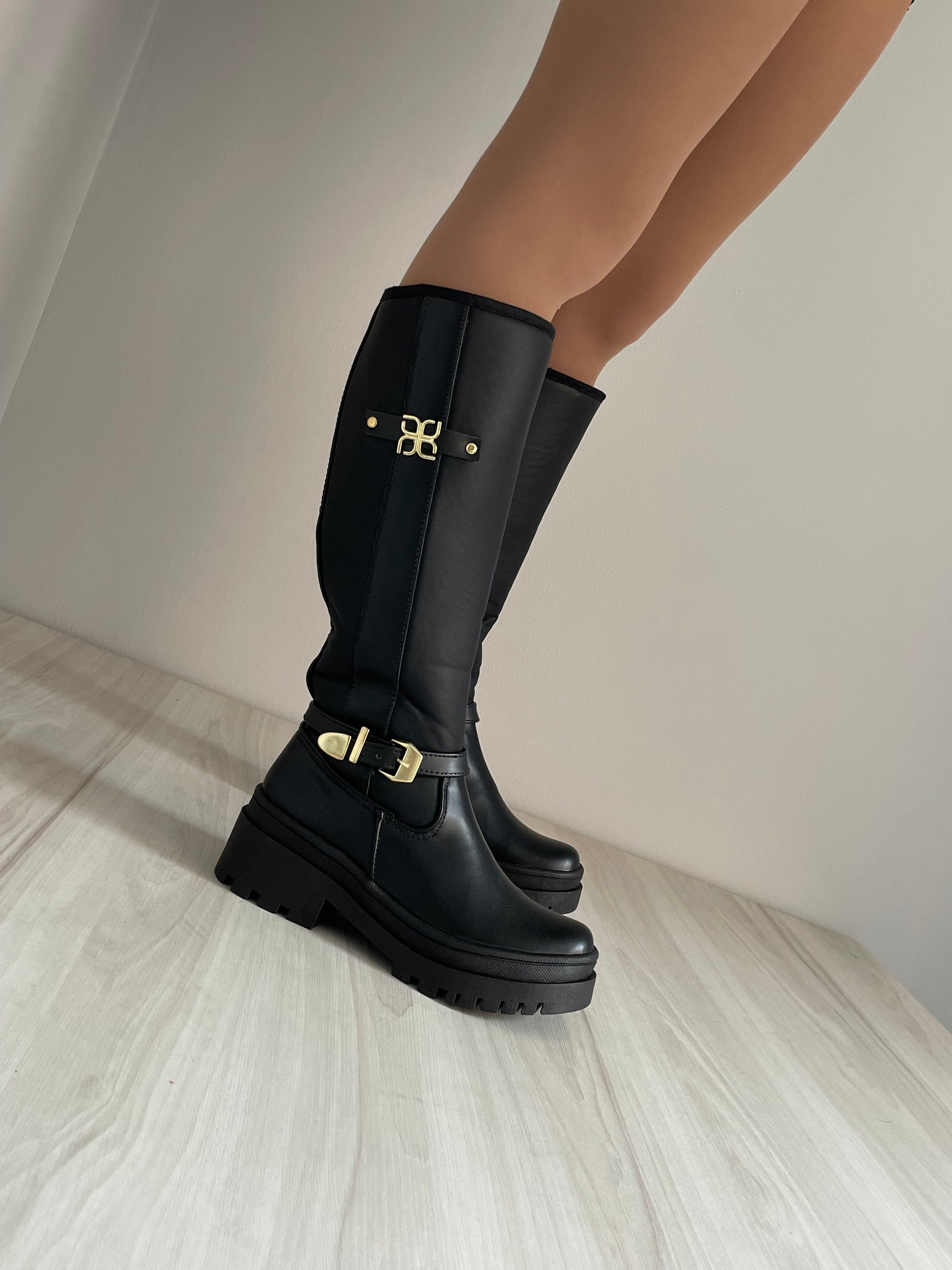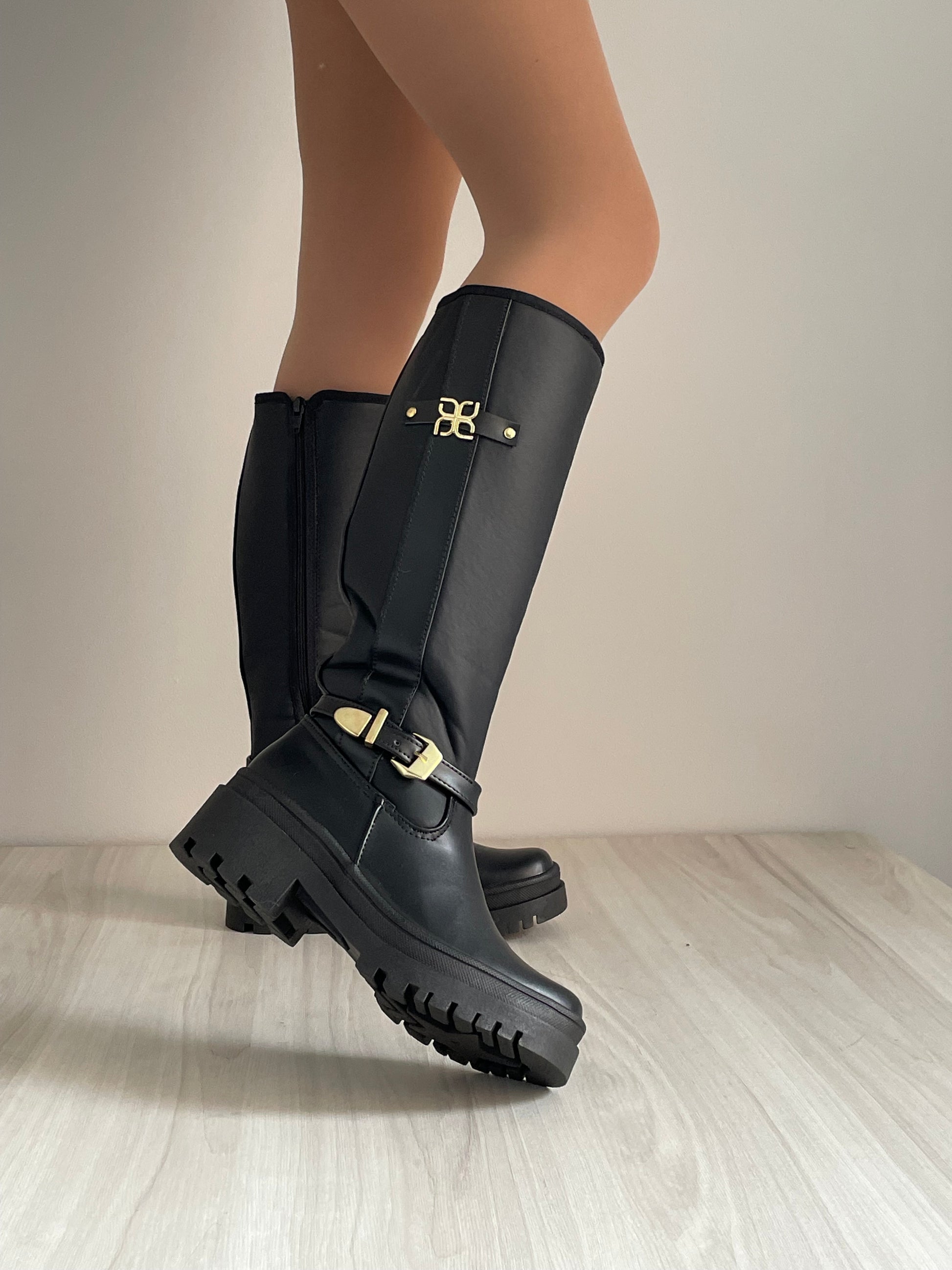 Nuestras botas negras de caña alta con herrajes dorados son el match perfecto entre elegancia y comodidad.